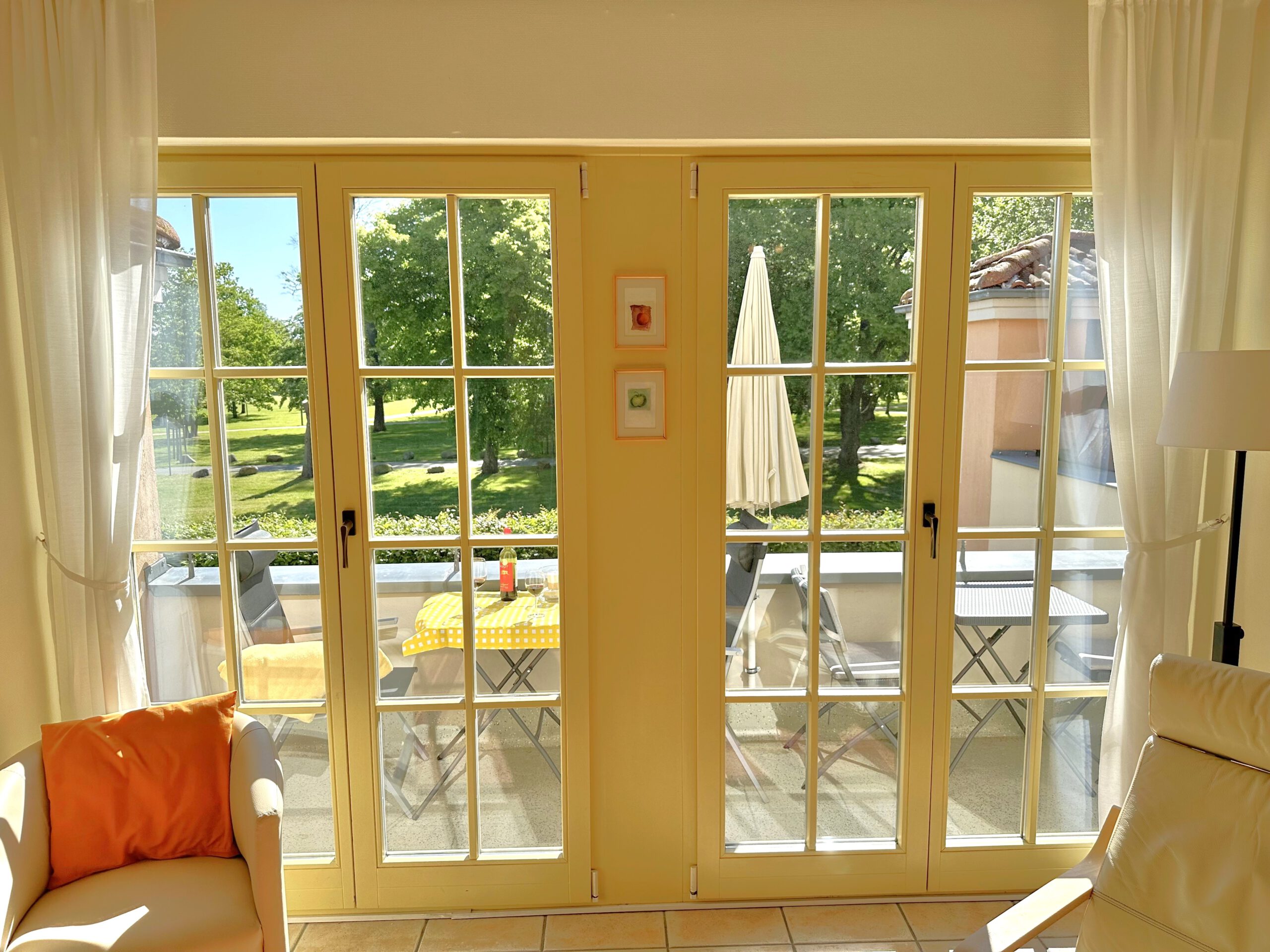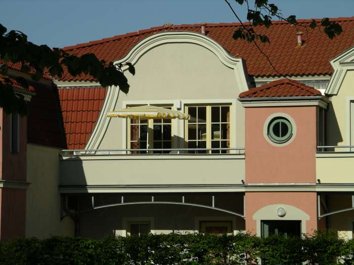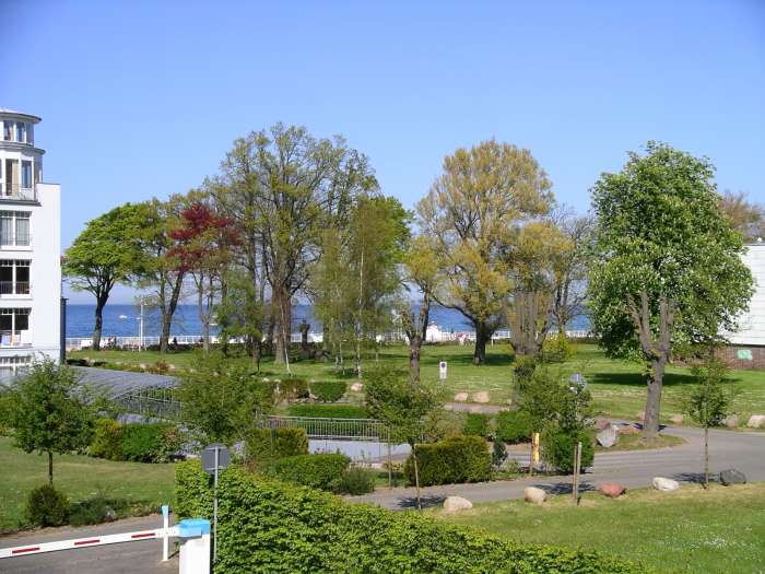 Inmitten der Gegenkolonnaden liegt im ersten Stock unsere Wohnung für 2 bis 4 Personen. Sie ist etwas ganz Besonderes. Eine Wohnung für Individualisten mit nur einem Flurnachbarn. Mit einem Balkon, den man nicht einsehen kann – voll Morgensonne und Blick durch den Balticpark zur See.